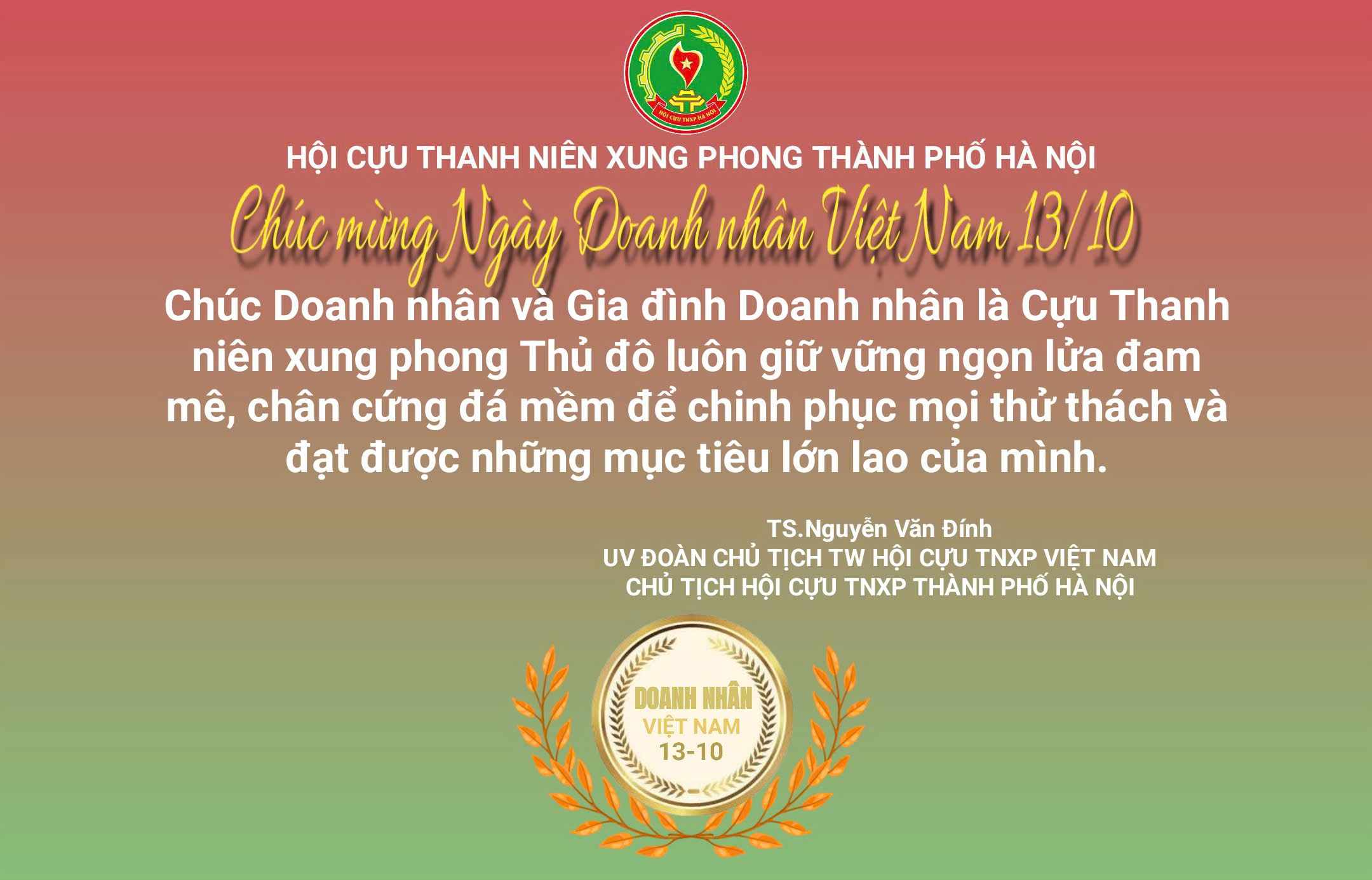 Nhân ngày Doanh nhân Việt Nam, Hội Cựu thanh niên xung phong Thành phố Hà Nội gửi tới các Doanh nhân và Gia đình doanh nhân là Cựu thanh niên xung phong Thủ đô Hà Nội tấm thiếp chúc mừng: