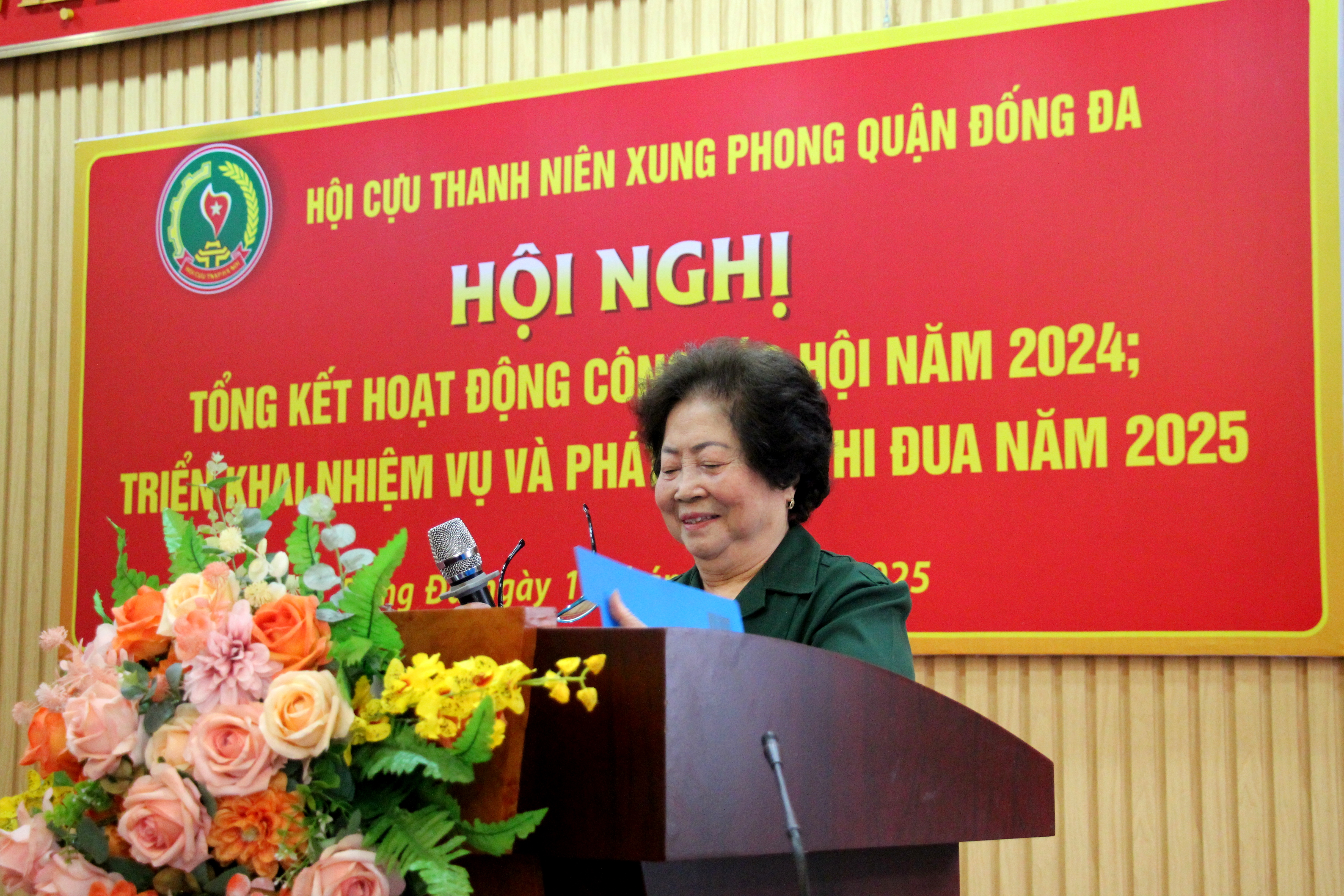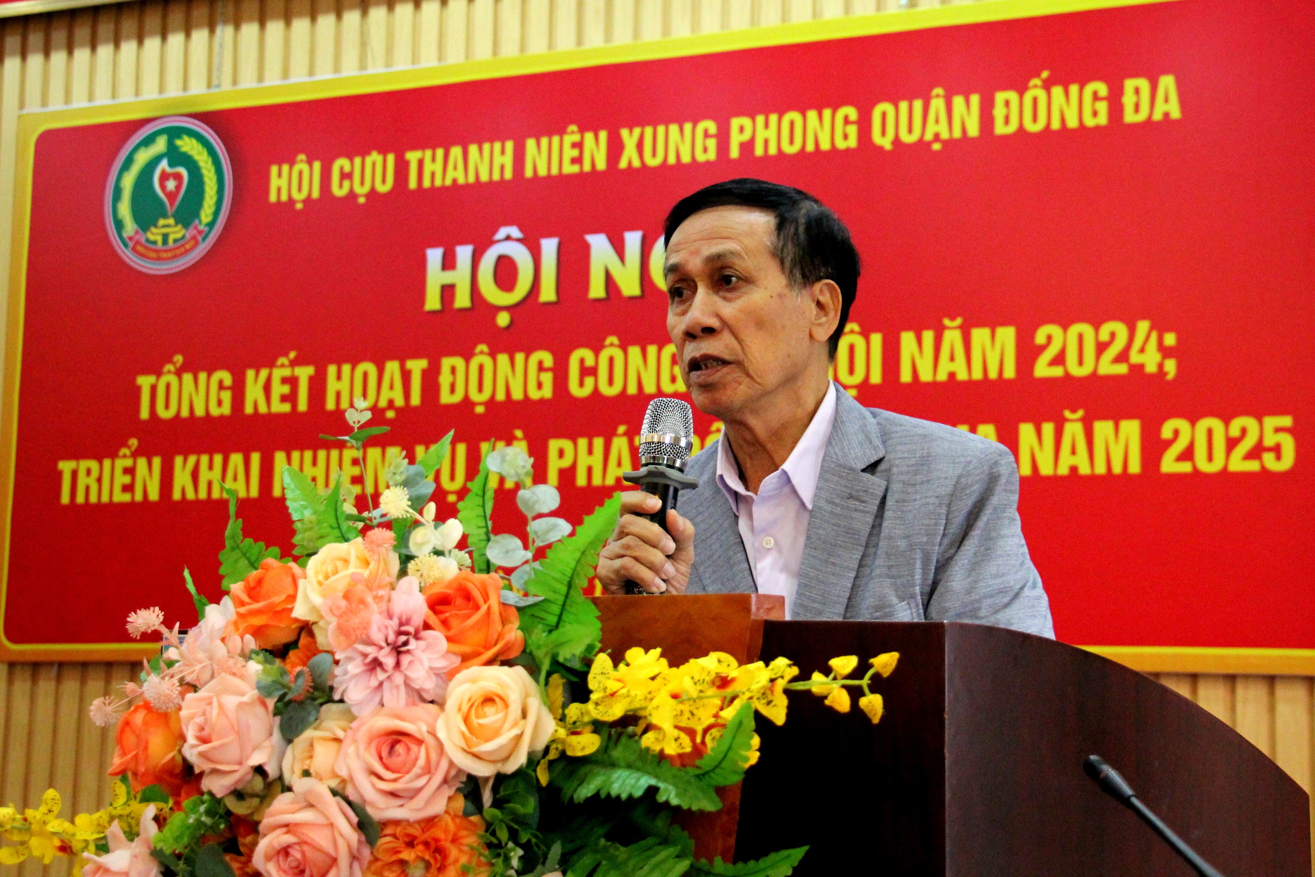 Ông Nguyễn Khổn - Ủy viên Thường vụ, Trưởng Ban Tổ chức Thi đua, tuyên truyền Hội cựu TNXP Thành phố Hà Nội phát biểu chúc mừng và ghi nhận các kết quả đạt được của Hội cựu TNXP quận Đống Đa. Đánh giá Quận Hội Đống Đa là một những đơn vị tốp đầu của Thành phố. Ông trân trọng khen ngợi hoạt động văn nghệ của Cựu TNXP quận Đống Đa rất mạnh. Đây cũng là yếu tố cần có để cán bộ hội viên cựu TNXP phải sống vui, sống khỏe nâng cao đời sống tinh thần. Đống Đa cũng là đơn vị tích cự cong tác hỗ trợ sủa chữa, xây dựng nhà cho hội viên có hoàn cảnh khó khăn lan tỏa được tính nhân văn vì Nghĩa tình đồng đội. Ông cũng đề nghị Đống Đa tiếp tục phát huy những thành tích đã đạt được, triển khai thực hiện nhiệm vụ năm 2025 để đạt nhiều kết quả thiết thực kỷ niệm 75 năm Ngày lực lượng TNXP Việt nam và kỷ niệm 20 năm thành lập Hội cựu TNXP Thành phố Hà Nội.