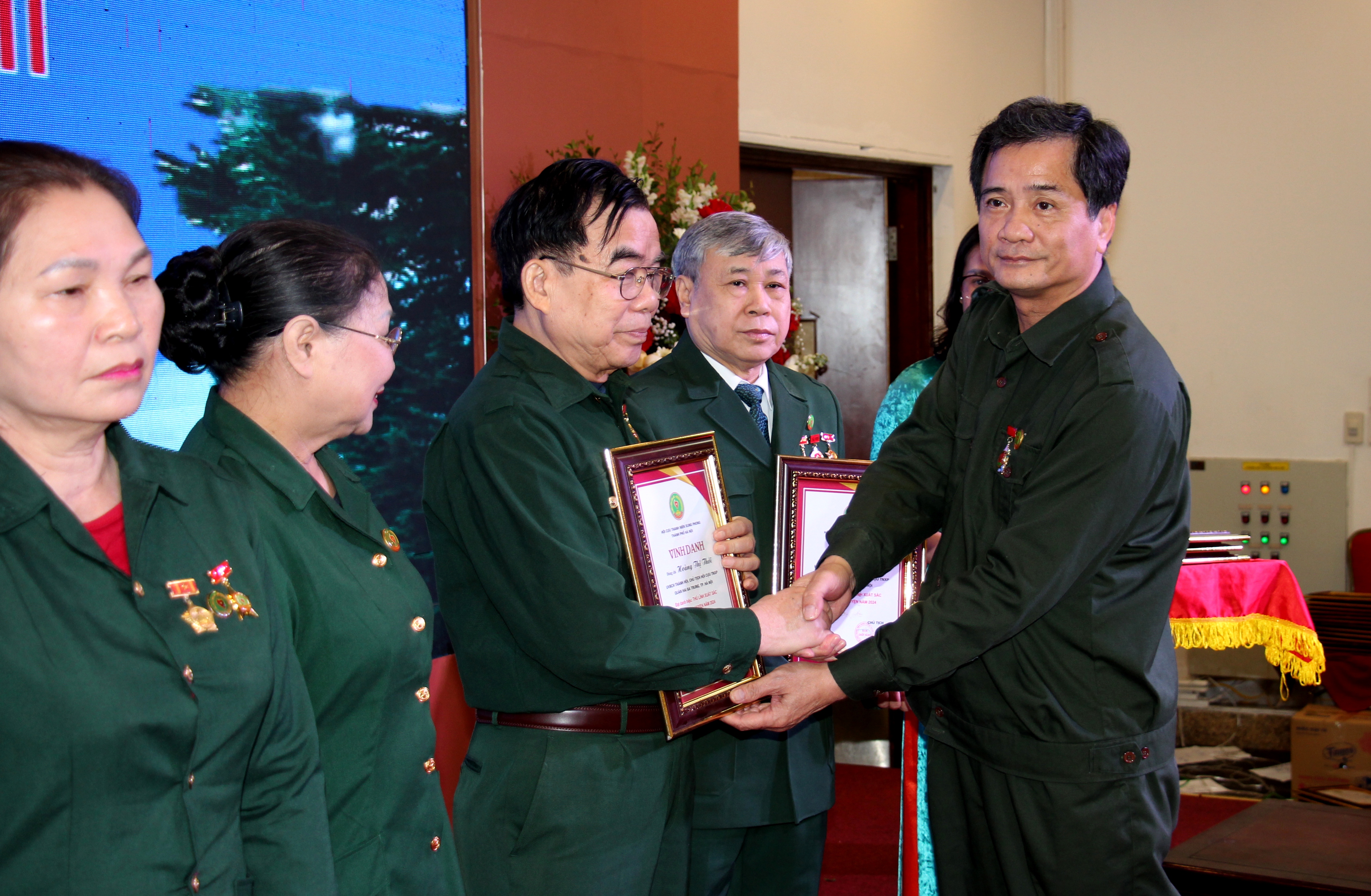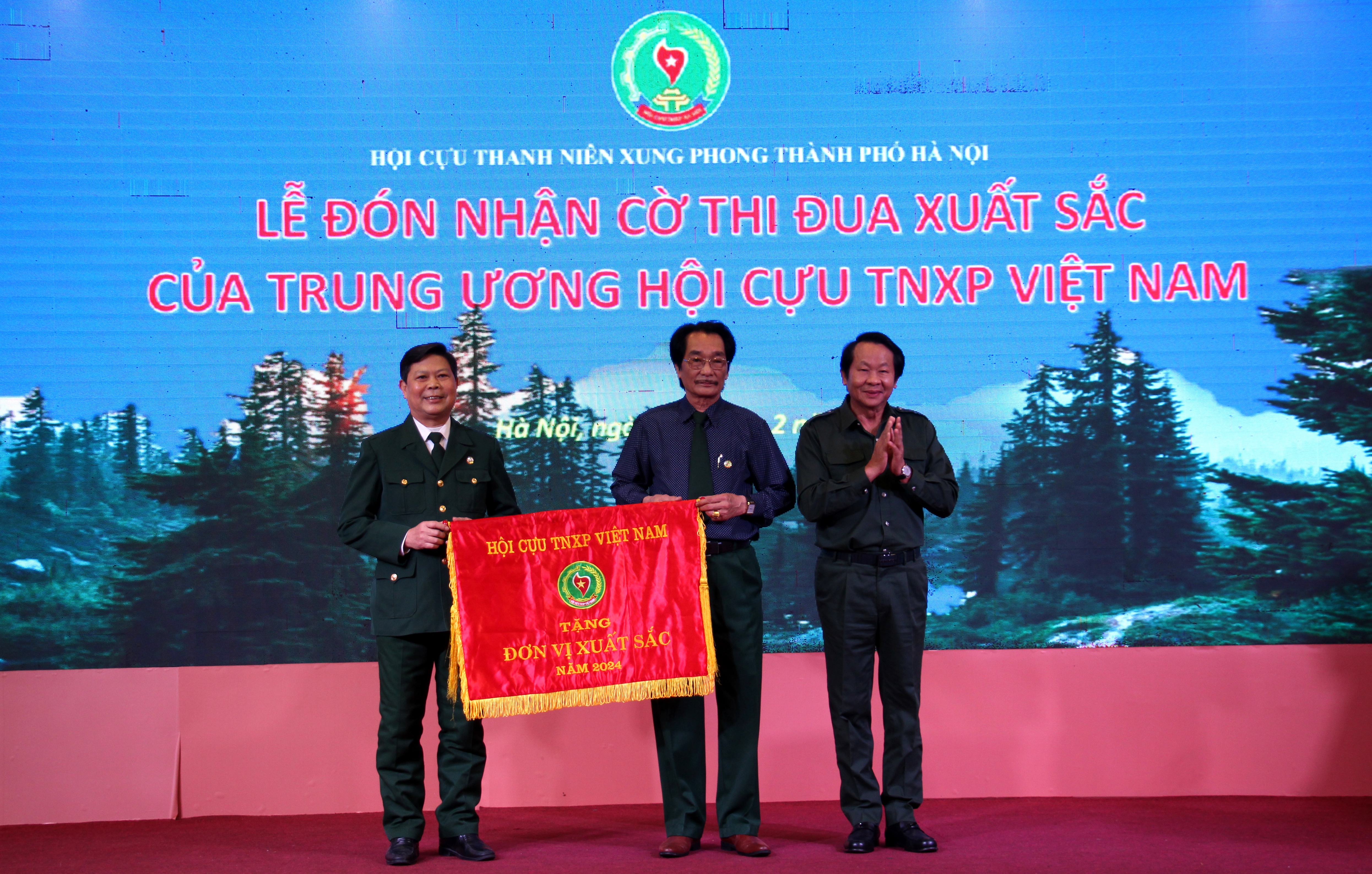 Đồng chí Thân Đức Nam - Phó Chủ tịch Trung ương Hội Cựu TNXP Việt Nam trao cờ thi đua xuất sắc năm 2024 cho Hội Cựu TNXP Thành phố Hà Nội