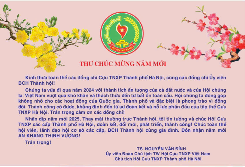 Năm 2024 kết thúc, năm 2025 khởi đầu, Đồng chí Nguyễn Văn Đính - Ủy viên Đoàn Chủ tịch Trung ương Hội cựu TNXP Việt Nam, Chủ tịch Hội cựu TNXP Thành phố Hà Nội có thư chúc mừng năm mới đến tất cả các hội viên, Ủy viên Ban chấp hành Hội Cựu Thanh niên xung phong Thành phố Hà Nội.