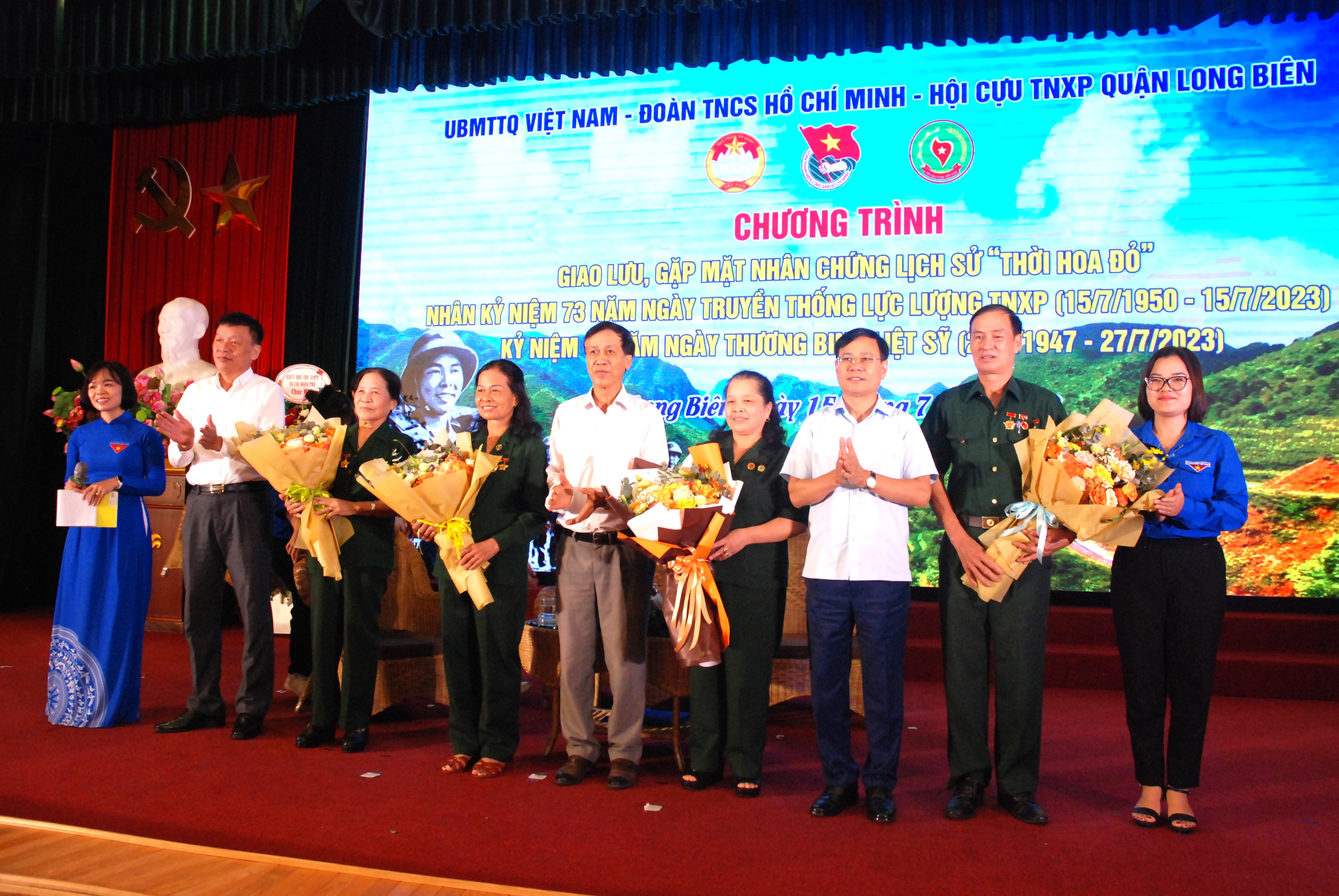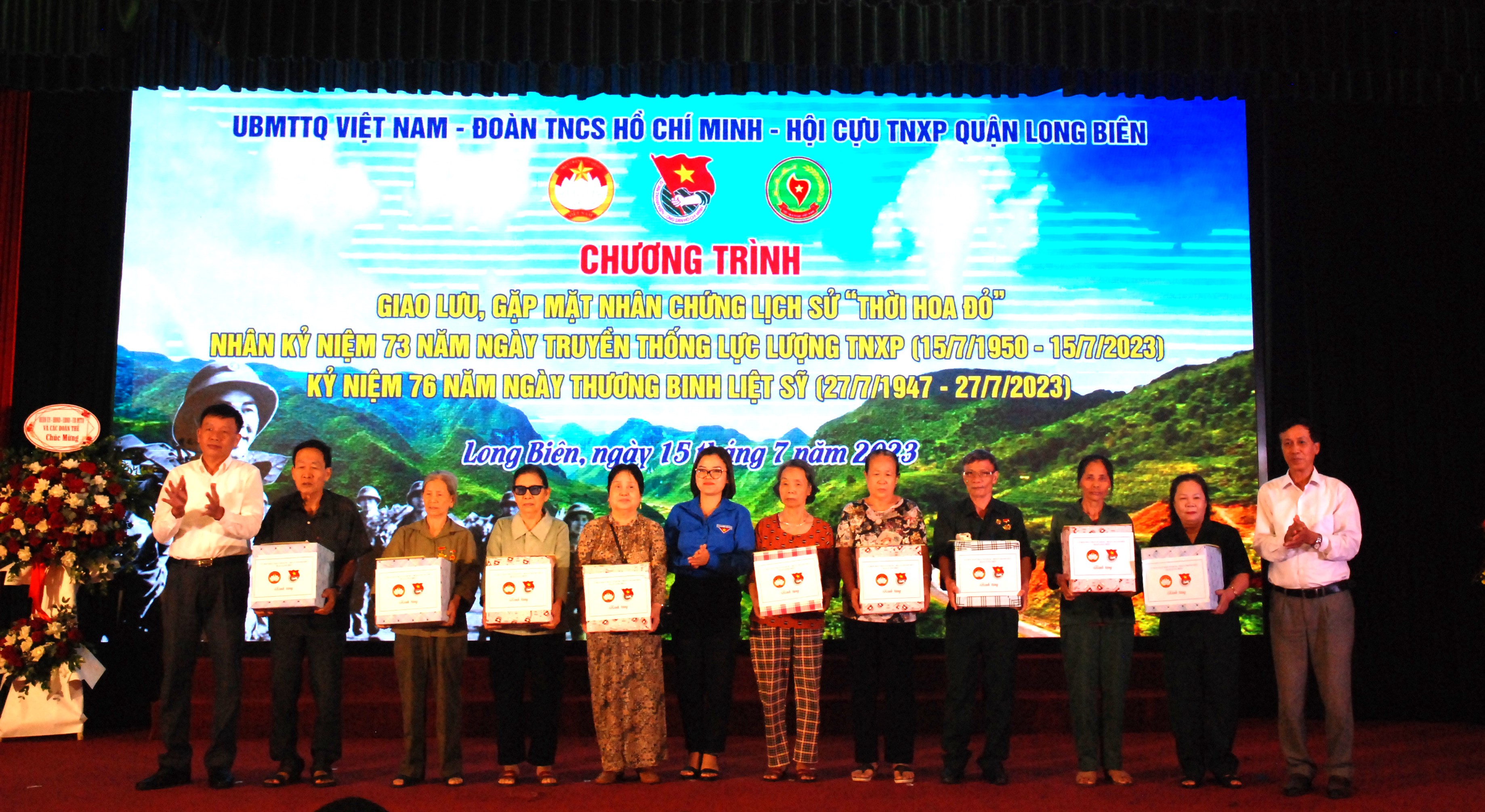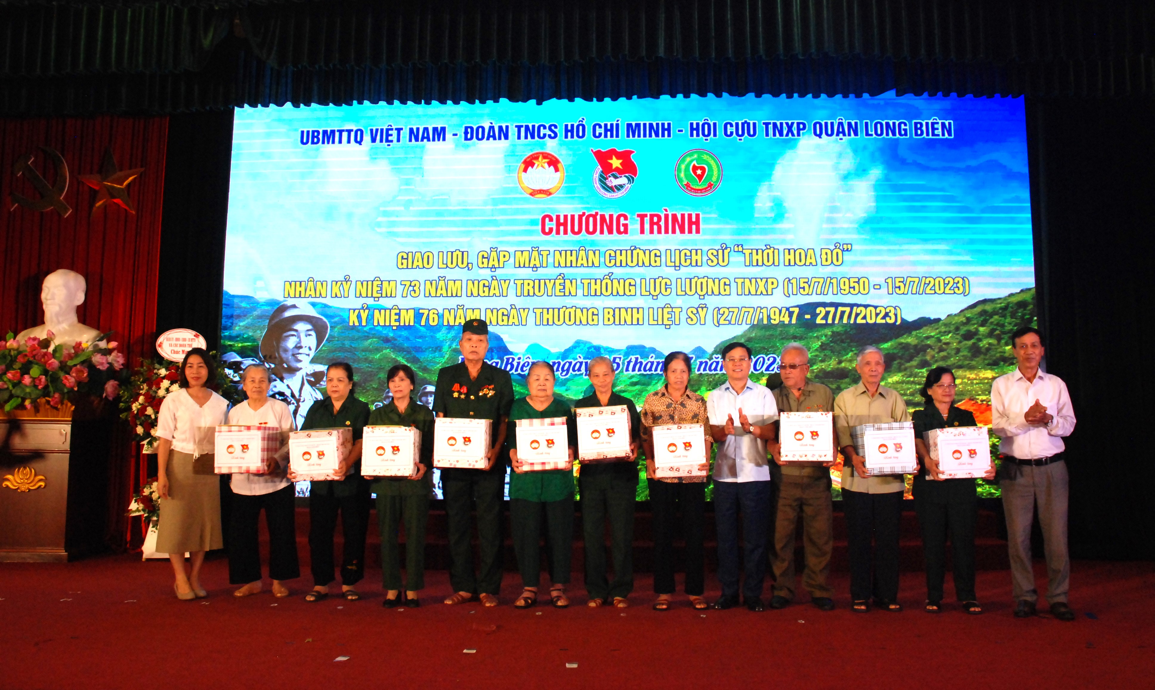 Dịp này, Quận ủy-HĐND-UBND-Ủy ban MTTQ và các đoàn thể quận Long Biên tặng hoa chúc mừng Hội Cựu thanh niên xung phong quận, nhân dịp kỷ niệm 73 năm Ngày truyền thống. Ủy ban MTTQ Việt Nam quận và Quận đoàn Long Biên tặng 20 suất quà đến 20 hội viên Hội Cựu thanh niên xung phong trên địa bàn có hoàn cảnh khó khăn, mỗi suất trị giá 2 triệu đồng.