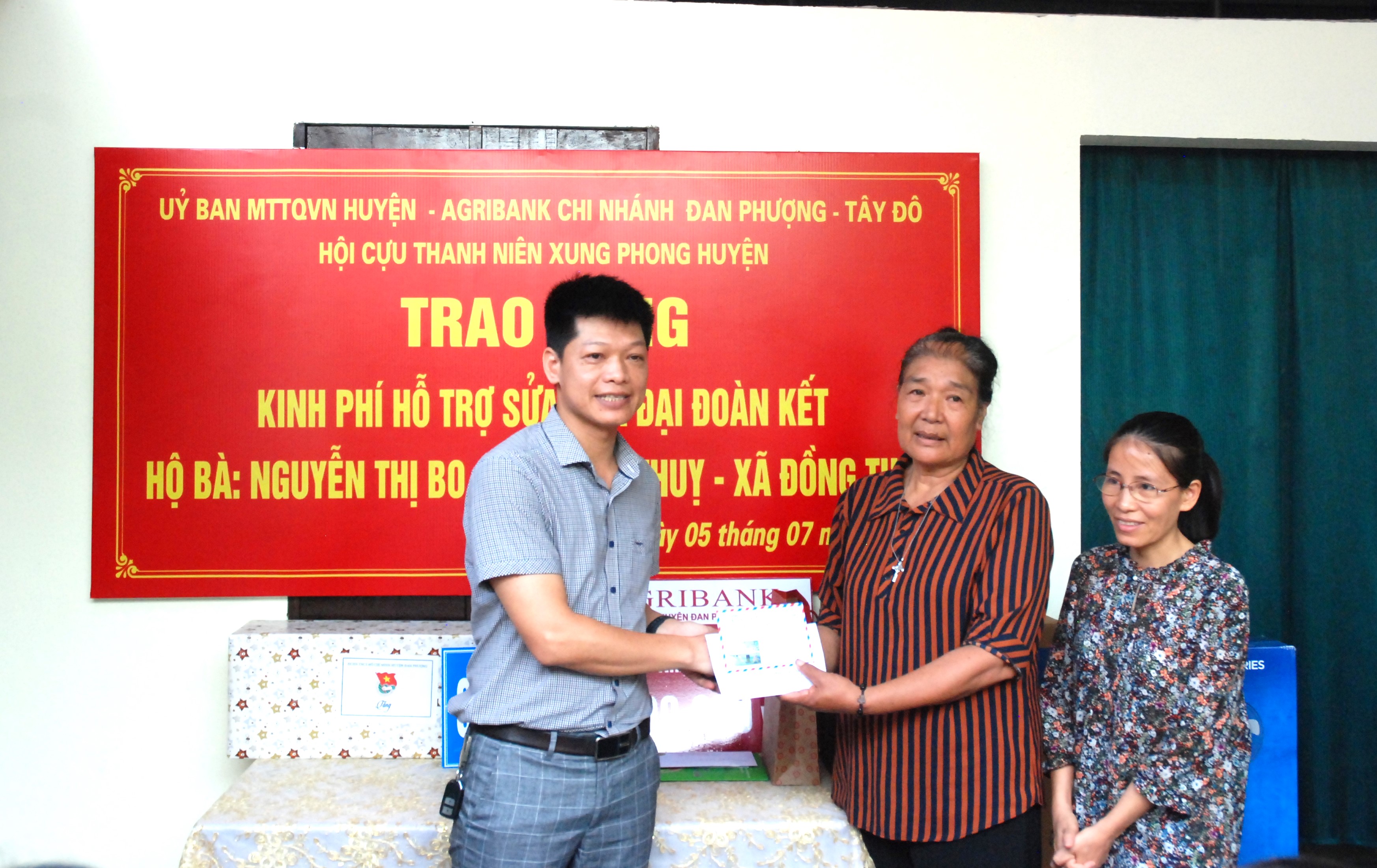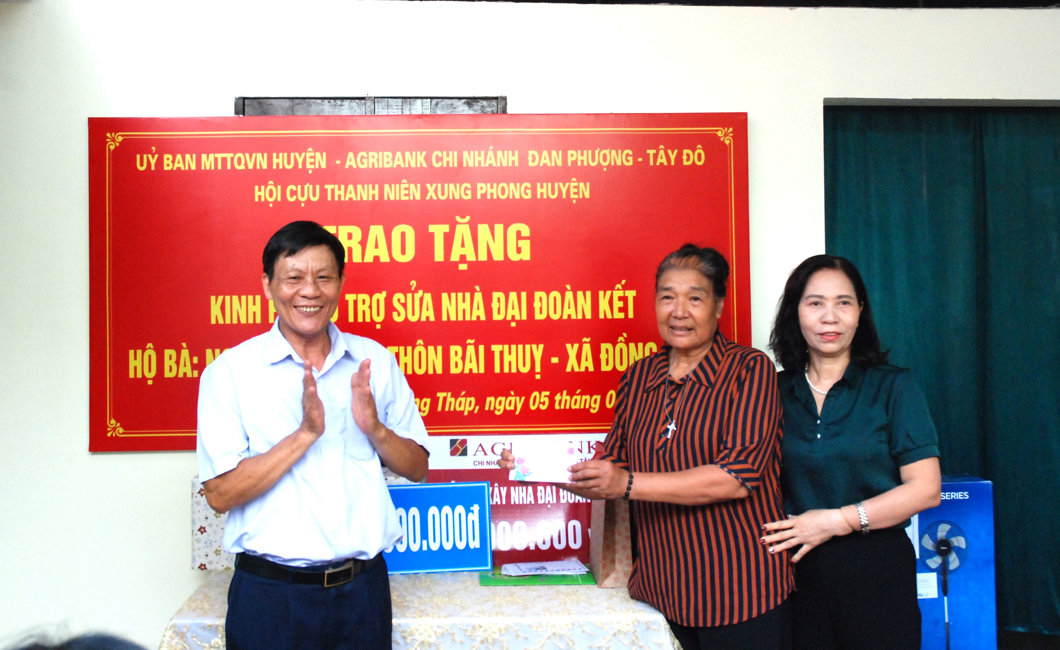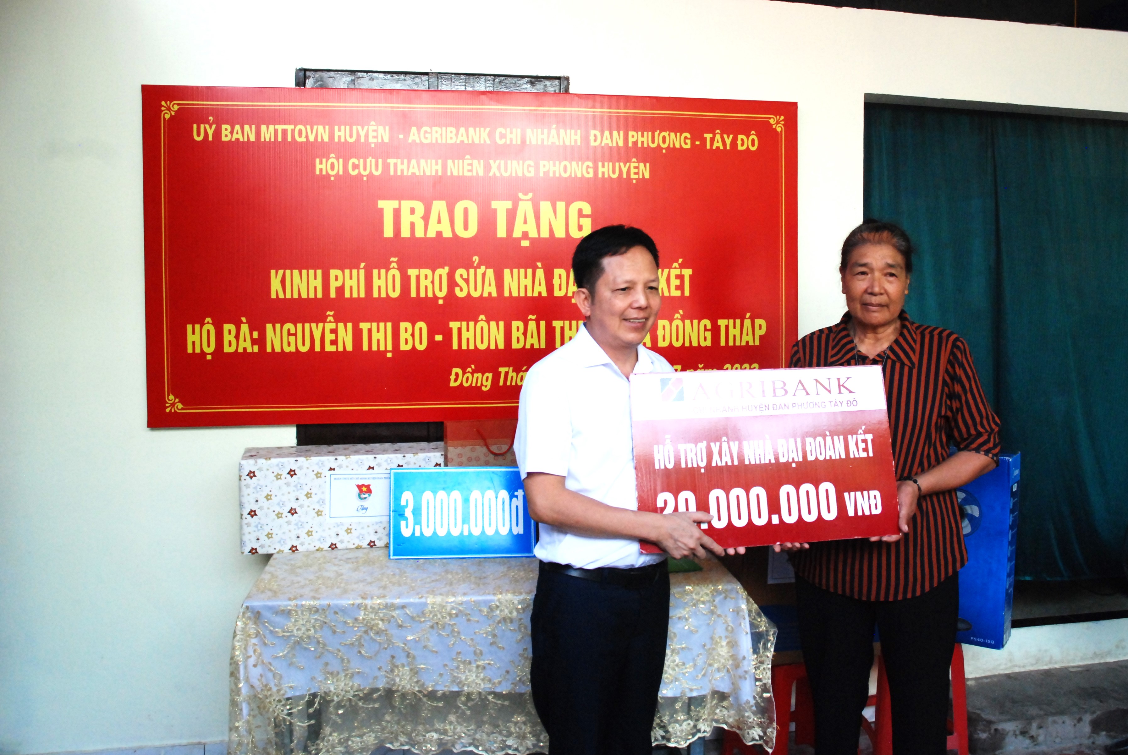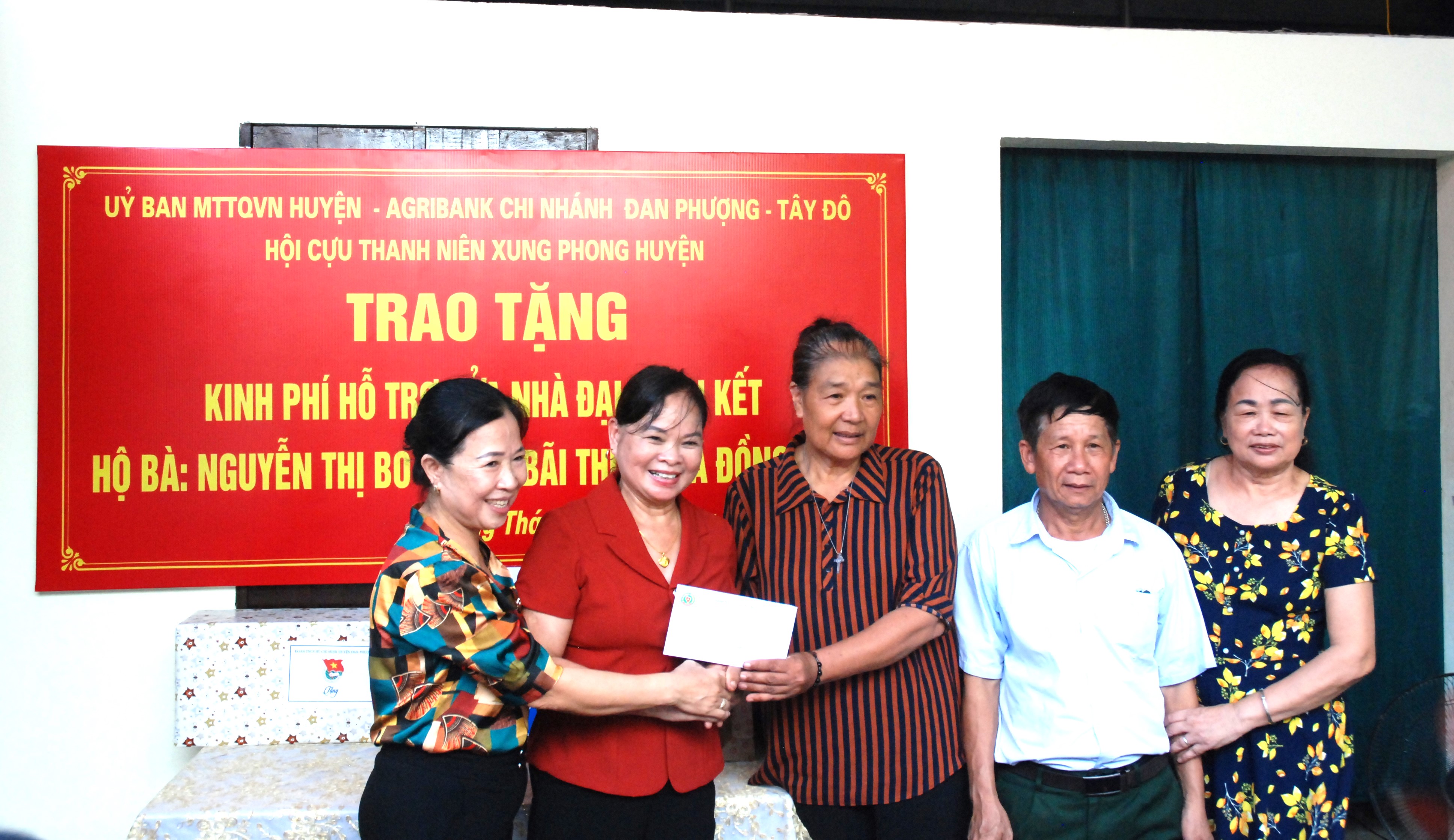Đại diện Ngân hàng Agribank chi nhánh Đan Phượng trao tặng kinh phí xây nhà cho bà Nguyễn Thị Bo