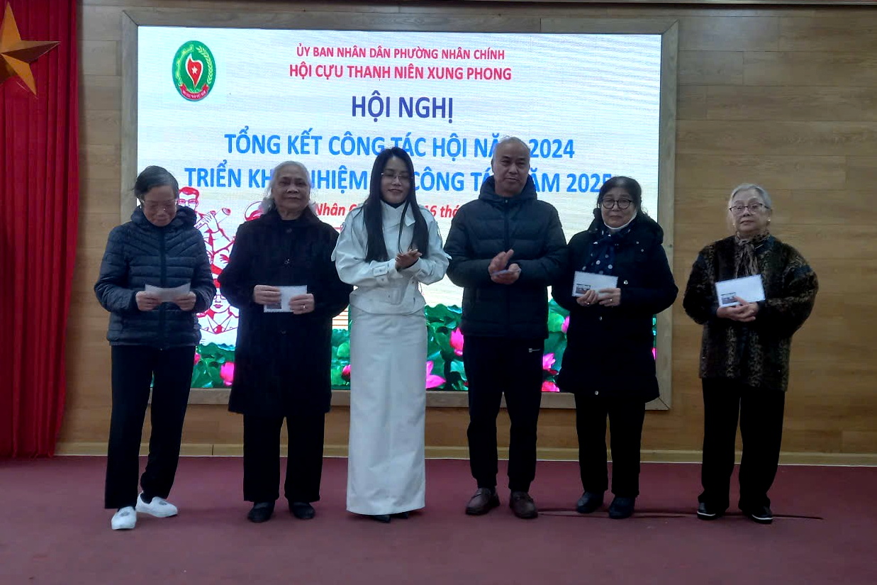 Đ/c Nguyễn Thị Hà Phương (áo tráng)- Đảng uỷ viên, Phó Chủ tịch UBND phường trao thưởng cho các hội viên Hội Cựu TNXP phường Nhân Chính