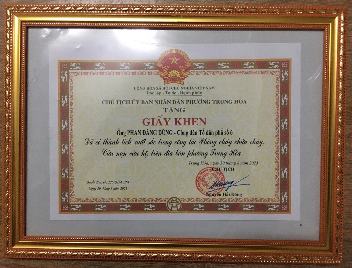 Giấy khen của UBND Phường Trung Hoà về thành tích trong công tác PCCC của anh Dũng