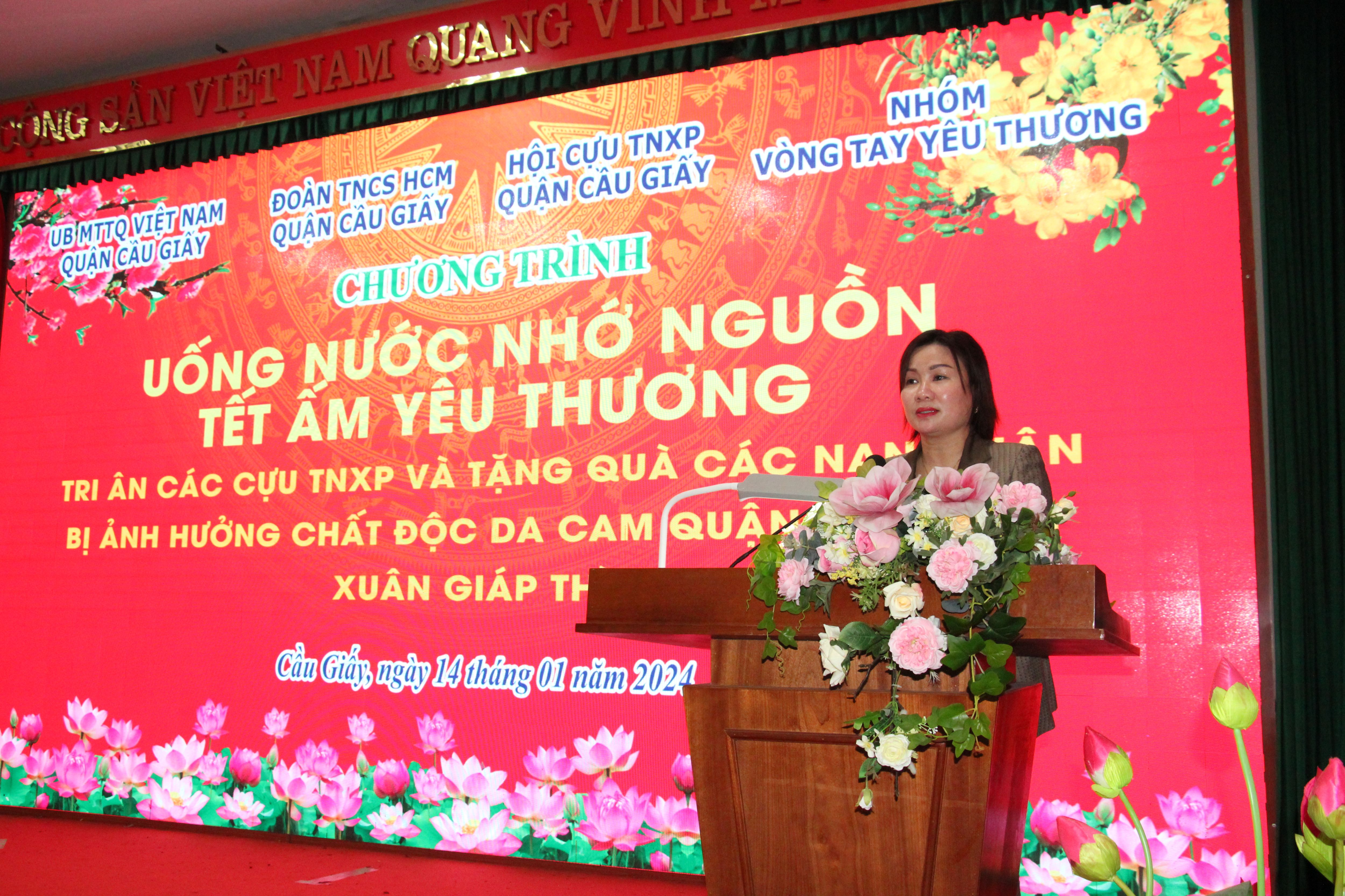 Thay mặt cán bộ, hội viên Hội cựu TNXP quận Cầu Giấy và những nạn nhân bị ảnh hưởng chất độc màu da cam Chủ tịch quận Hội Lê Thị Hồi đã cám ơn các quý vị lãnh đạo không quản trời mưa rét đã đến dự Chương trình: Uống nước nhớ nguồn-Tết ấm yêu thương, “Tri ân các Cựu TNXP và tặng quà các nạn nhân bị ảnh hưởng bởi chất độc màu da cam quận Cầu Giấy, Xuân Giáp Thìn 2024”. Cám ơn UB MTTQ VN Q. Cầu Giấy và Nhóm “Vòng tay Yêu thương” đã quan tâm tặng quà, Cám ơn Đoàn Thanh niên Cộng sản HCM đã phối hợp tổ chức.