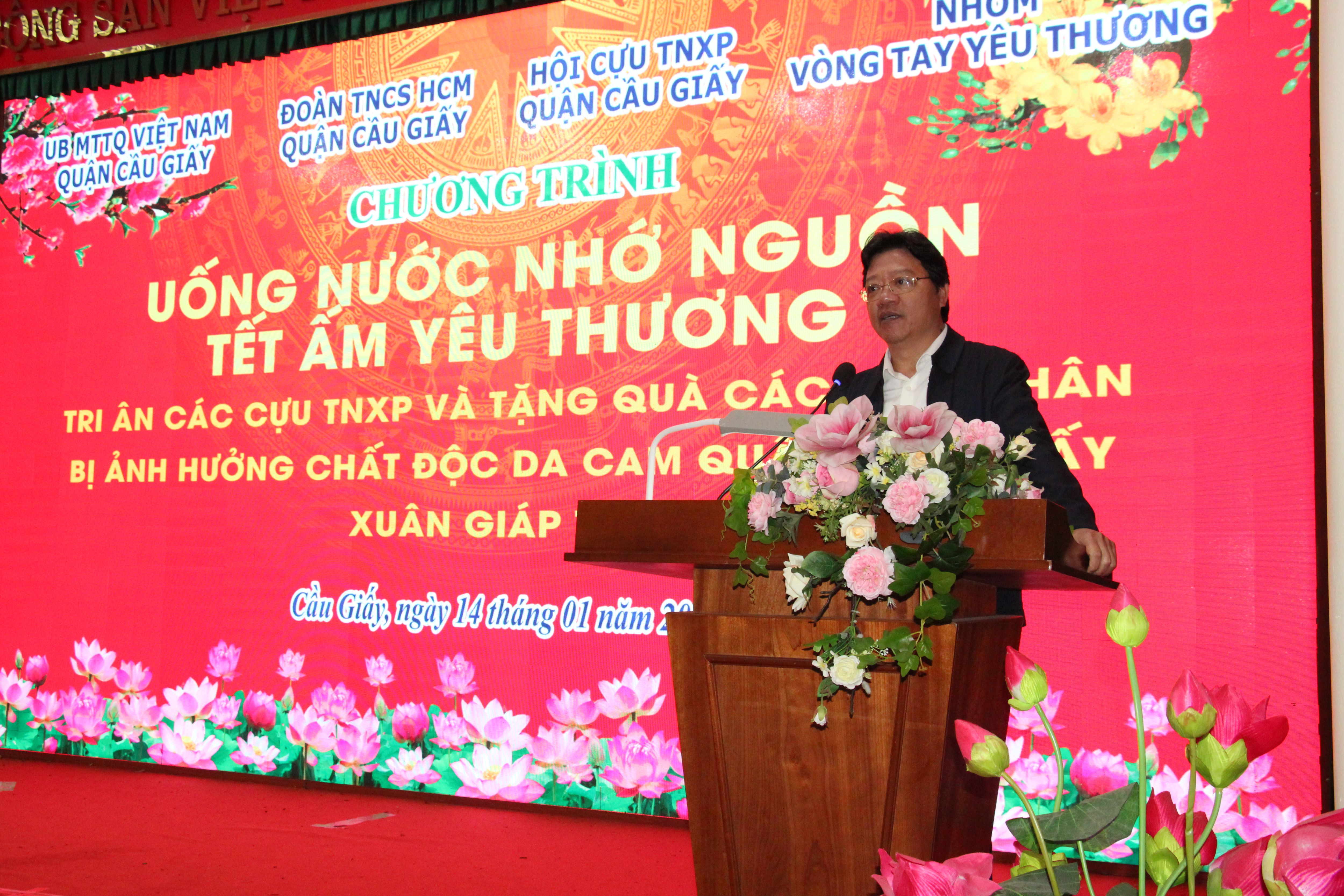 Đ/c Nguyễn Thanh Hải - UVTT, Trưởng Ban tổ chức UB MTTQ VN Thành phố Hà Nội đã phát biểu, biểu dương, ghi nhận những việc làm của UB MTTQ VN quận Cầu Giấy những năm qua, đã thực hiện được nhiều chương trình rất ý nghĩa. Mỗi dịp Tết đến Xuân về, các chương trình gặp mặt tặng quà với số lượng và đối tượng được tặng quà đã tăng lên cả trên địa bàn quận, trong thành phố và trên địa bàn các tỉnh thành khác. Đ/c mong muốn UB MTTQ VN quận Cầu Giấy tiếp tục phát huy những kết quả đạt được, phấn đấu có nhiều chương trình tri ân tặng quà, động viên, giúp đỡ cho nhiều đối tượng có hoàn cảnh khó khăn, kém may mắn hơn nữa. Đ/c cũng rất cảm động khi các Cựu TNXP đã từng cống hiến hết mình trong các cuộc kháng chiến chống ngoại xâm, về hưu vẫn tiếp tục cống hiến, tham gia công tác đóng góp xây địa phương. Đ/c mong rằng Hội cựu TNXP sẽ “ Sống vui, sống khỏe, sống có ích” và tiếp tục phát huy truyền thống, giáo dục truyền thống để thế hệ trẻ tiếp bước, noi theo. Đ/c cũng đánh giá cao sự cố gắng của Nhóm “Vòng tay yêu thương”, mặc dù bản thân thành viên còn có khó khăn nhưng vẫn dành dụm, hoặc vận động thêm để thực hiện các chương trình tri ân ý nghĩa như ngày hôm nay.