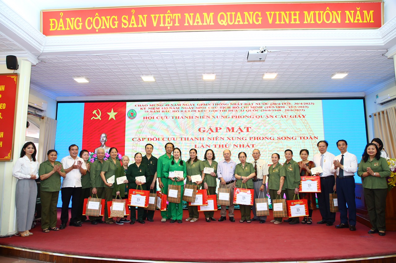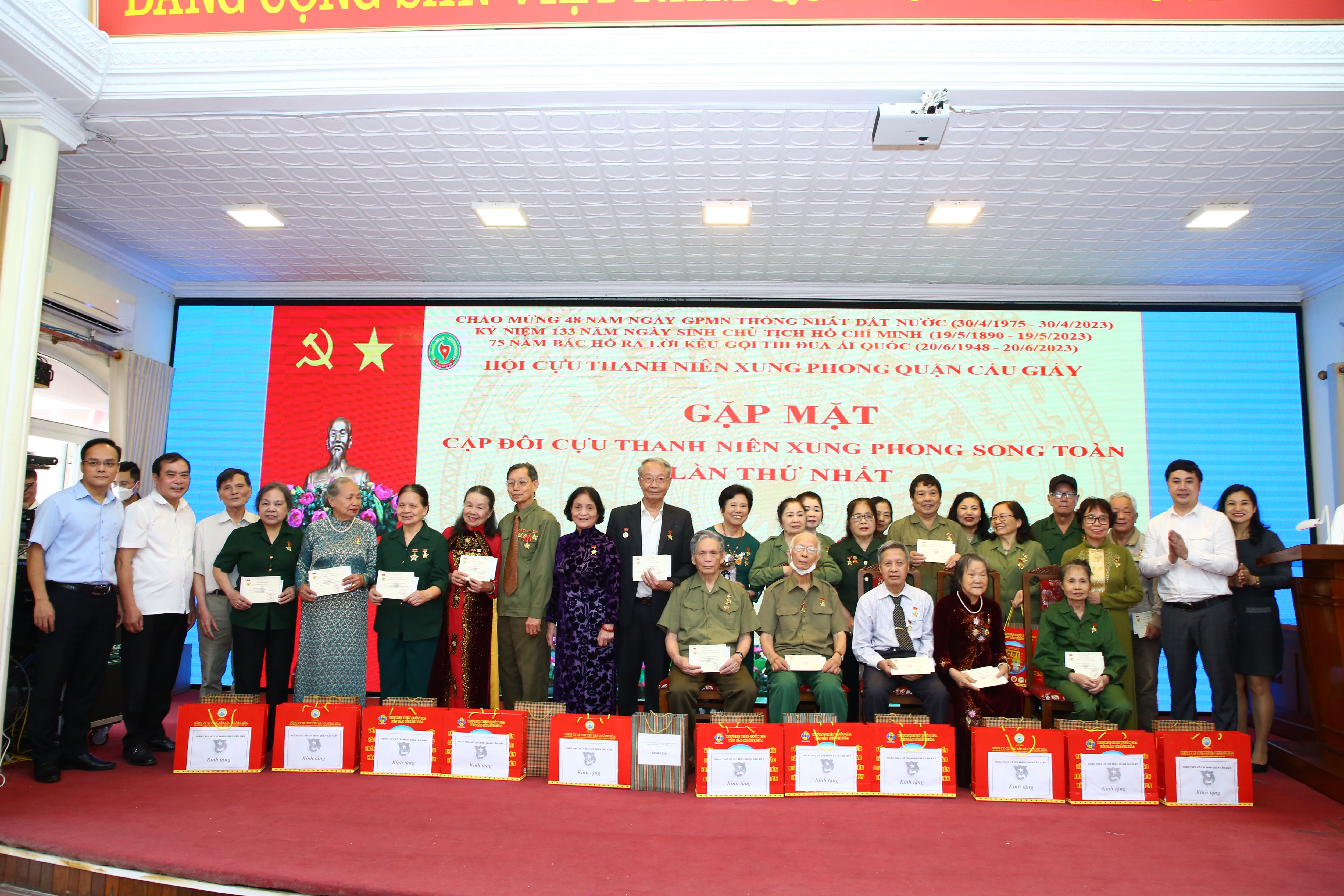 Tại buổi gặp mặt, các đồng chí đại diện lãnh đạo Thành Hội; Quận ủy – HĐND - UBND, các ban ngành đoàn thể và Quận hội đã trao tặng cho 43 cặp đôi cựu TNXP song toàn Huy hiệu “Cựu TNXP làm theo lời Bác” do Trung ượng Hội tặng; quà của đơn vị bạn - huyện Đông Anh; quà của Hợp tác xã Cựu TNXP Thủ Đô; quà của Quận Đoàn Cầu Giấy; quà của Hội Cựu TNXP Quận Cầu Giấy..jpg)