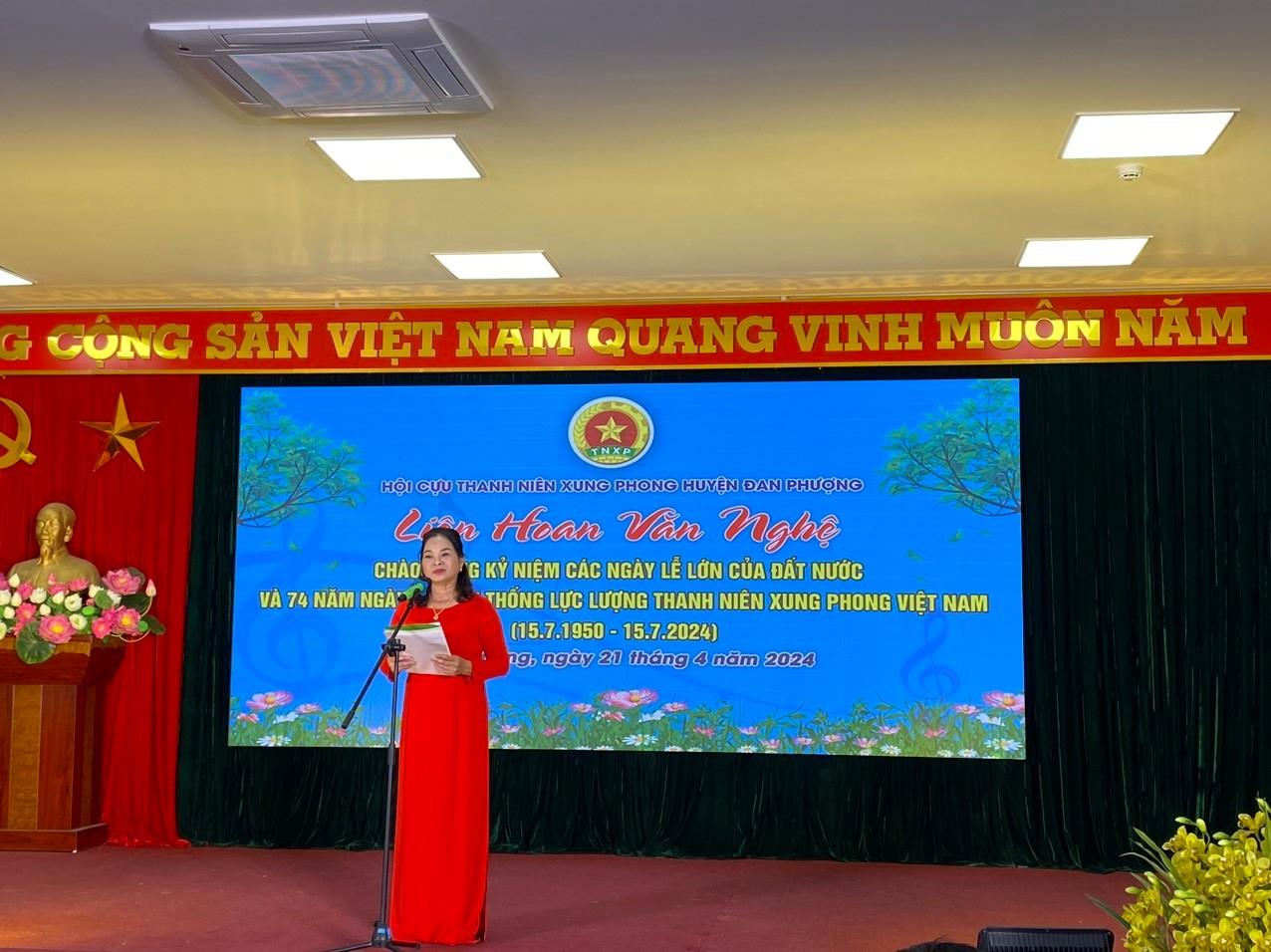 Phát biểu khai mạc đồng chí Nguyễn Thị Tuyết - Chủ tịch Hội Cựu Thanh niên xung phong Huyện nhấn mạnh: “Liên hoan văn nghệ Cựu Thanh niên xung phong huyện Đan Phượng là đợt sinh hoạt mang nhiều ý nghĩa, khơi dậy niềm tự hào về một thời hoa lửa "Tiếng hát át tiếng bom" năm xưa trên những cung đường Trường Sơn huyền thoại, trong những năm tháng cống hiến tuổi thanh xuân, bảo vệ biên giới, hải đảo hay trong xây dựng và khắc phục hậu quả của chiến tranh, dù là thời điểm nào thì các Cựu thanh niên xung phong huyện Đan Phượng cũng luôn là những tấm gương sáng cho thế hệ trẻ noi theo trong chặng đường 74 năm của các thế hệ Thanh niên xung phong Việt Nam.