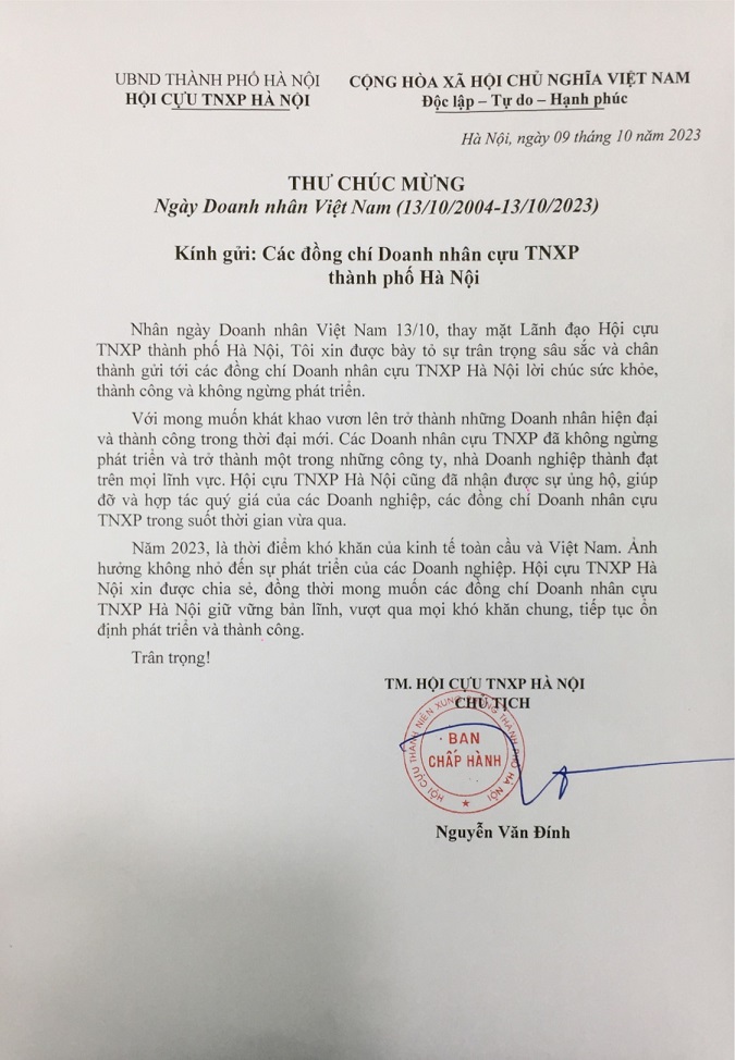 Thư chúc mừng ngày Doanh nhân Việt Nam 13/10/2023